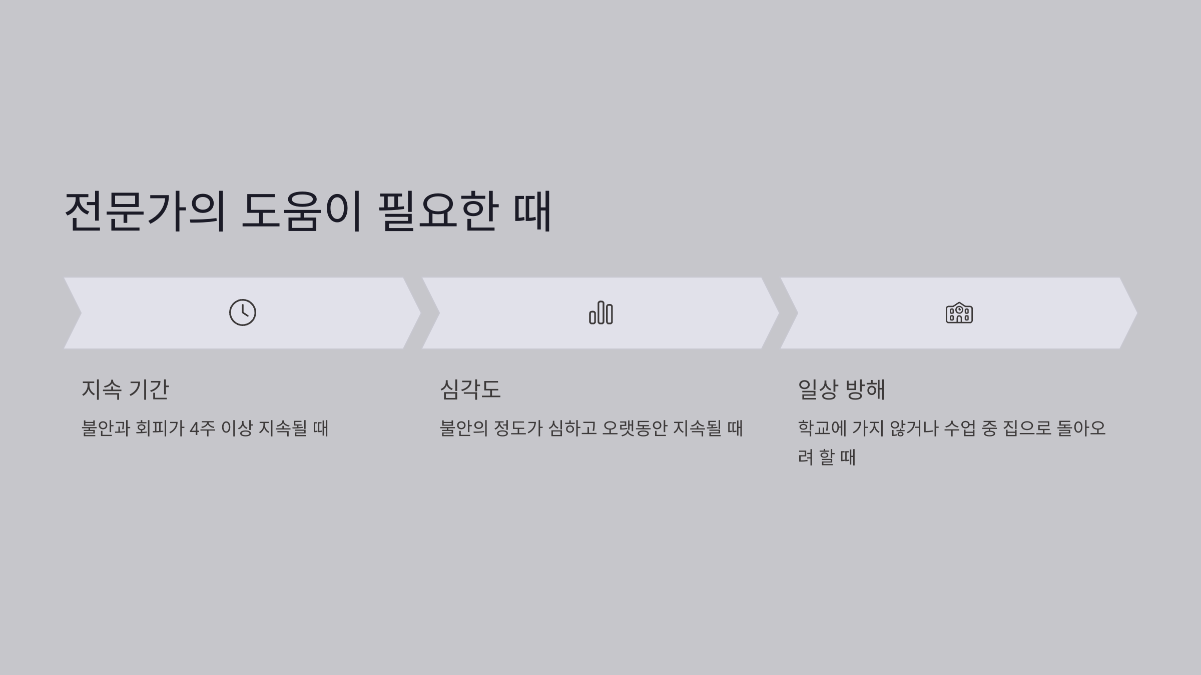 - 학교에 가지 않으려 하거나, 수업 중간에 집으로 돌아오는 등 일상생활에 심각한 지장이 있는 경우