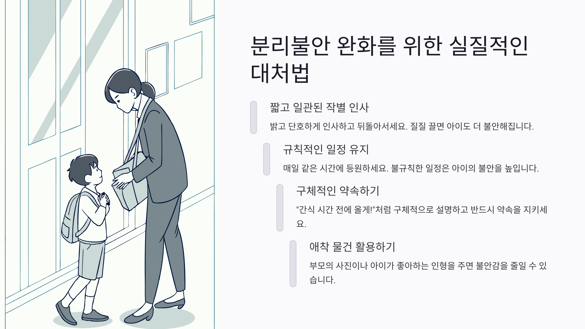 - 아이와 작별 인사를 한 후에는 단호하게 가야 해요. "엄마는 일하러 가고, 너는 선생님이랑 재미있게 놀자~"라고 밝고 단호하게 인사하고 뒤돌아서세요. 질질 끌면 아이도 더 불안해지고 분리가 더 어려워져요.