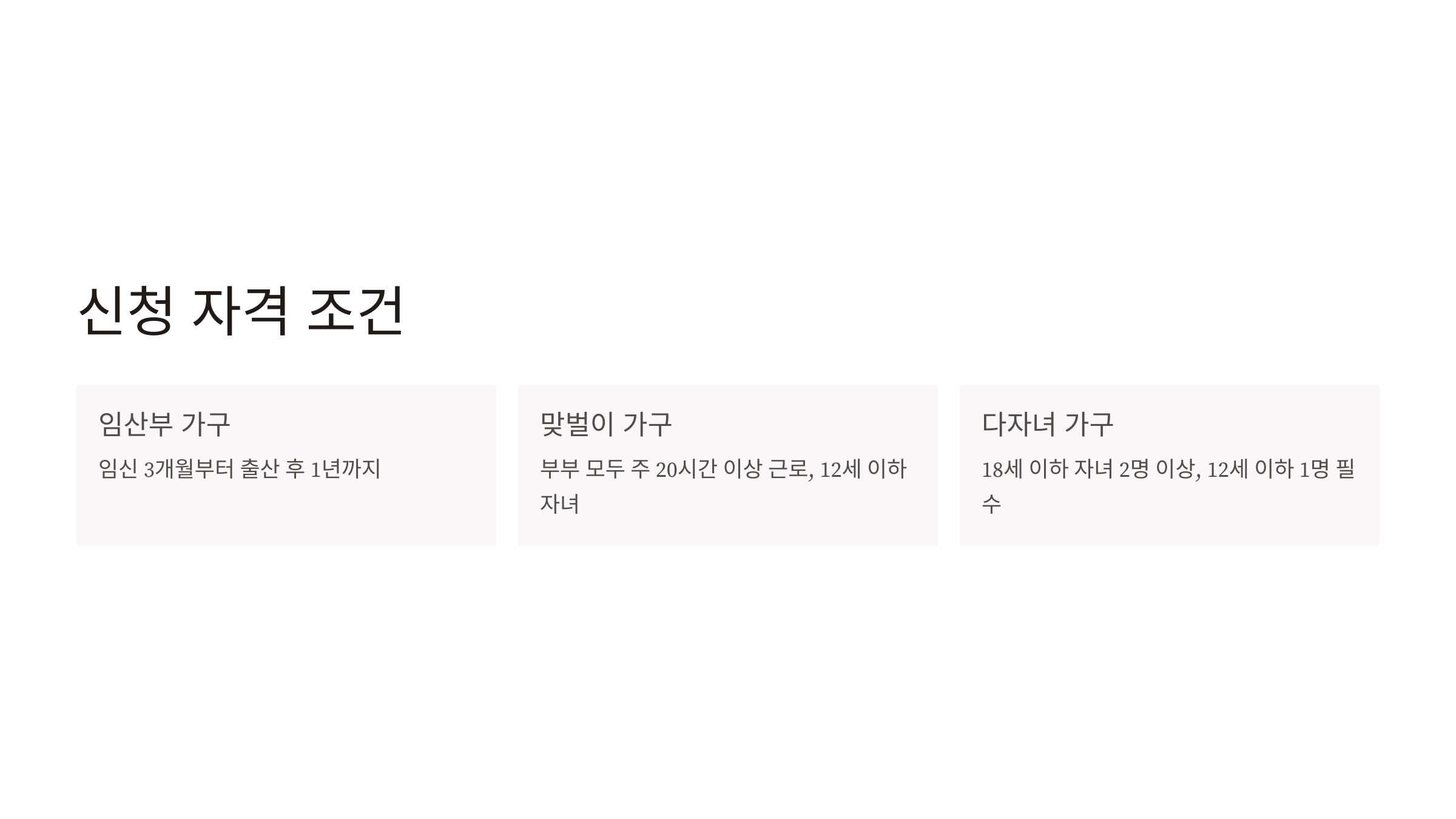 - 단, 12세 이하 자녀가 반드시 1명 이상 있어야 함 (2025년 신규 조건)