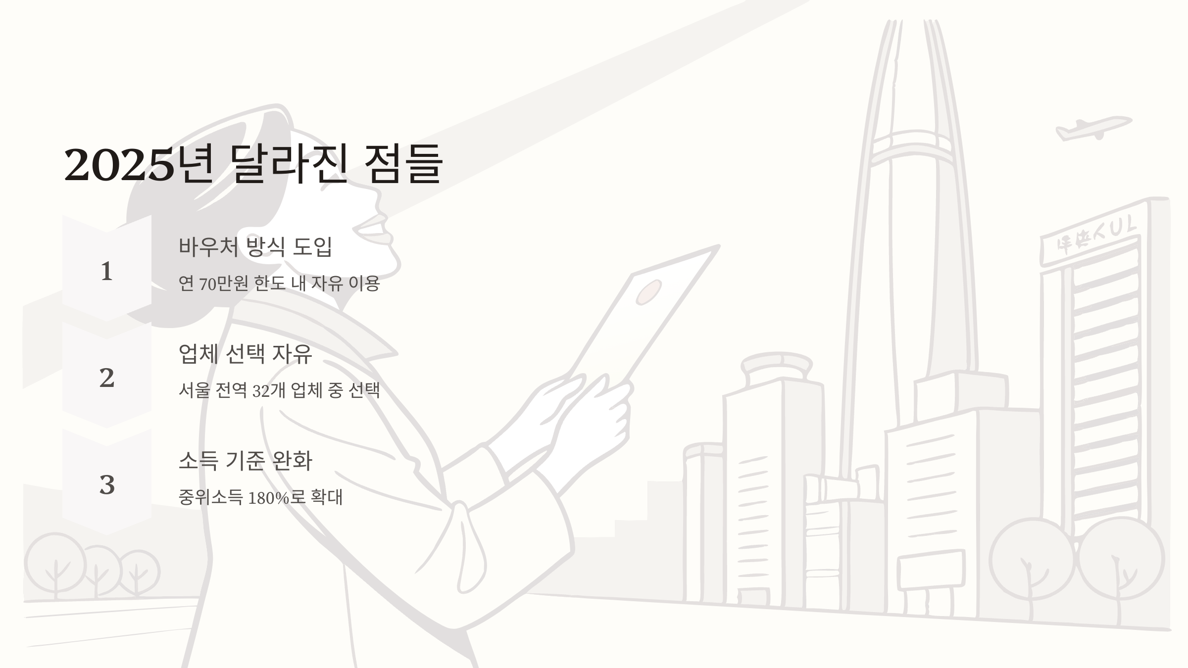 안녕하세요! 오늘은 서울에 거주하는 육아맘들과 임산부분들께 정말 도움이 될 만한 서울형 가사서비스에 대해 자세히 알려드릴게요. 2025년부터 많은 부분이 바뀌었는데, 특히 바우처 방식으로 변경되면서 훨씬 편리해졌답니다.