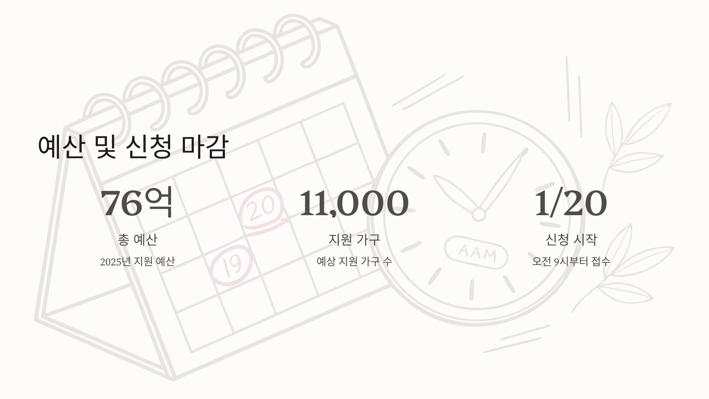 2025년에는 총 76억 2,500만원의 예산으로 11,000가구를 지원할 예정이에요. 1월 20일 오전 9시부터 신청을 받기 시작했는데, 예산이 소진되면 조기 마감될 수 있어요.