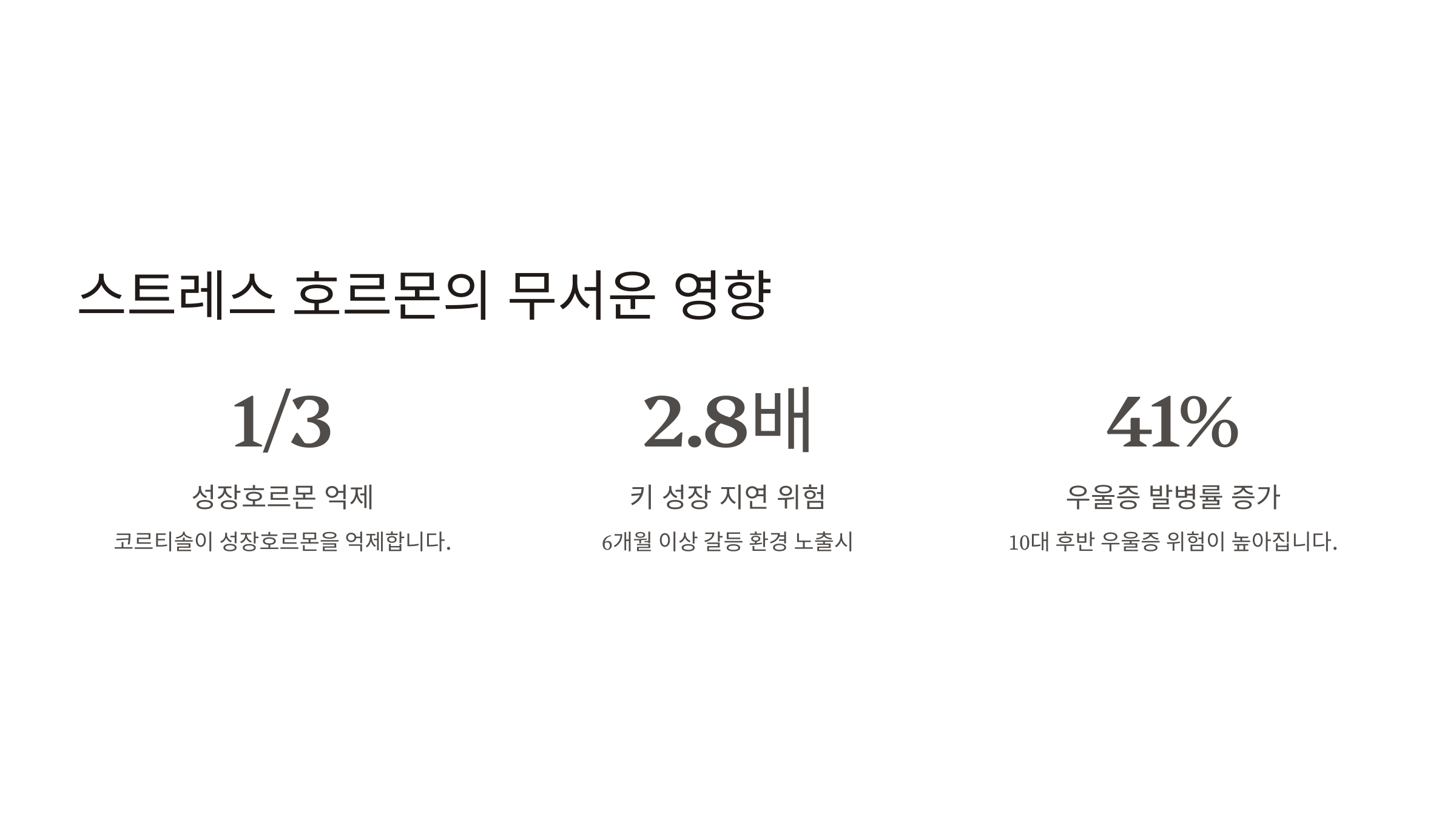 부모 갈등을 지속적으로 목격한 아이들의 몸에서는 코르티솔이라는 스트레스 호르몬이 과다 분비돼요. 이 호르몬이 문제인 이유는 성장호르몬 분비를 3분의 1 수준으로 억제해버리기 때문이에요. 실제로 6개월 이상 갈등 환경에 노출된 아이들은 키 성장이 지연될 위험이 2.8배나 높아진다고 해요.