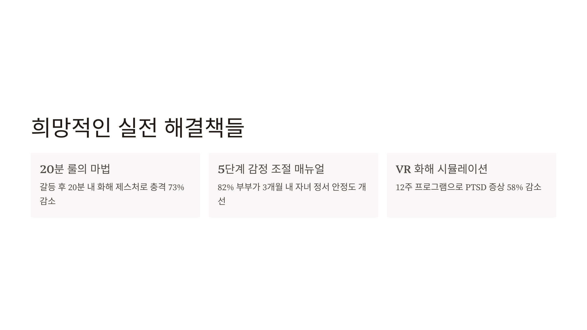 2024년 서울시교육청에서 개발한 '5단계 감정 조절 매뉴얼'을 사용한 부부들의 82%가 3개월 내에 자녀의 정서 안정도 개선을 경험했다고 해요. 이런 체계적인 접근법이 정말 도움이 되는 것 같아요.