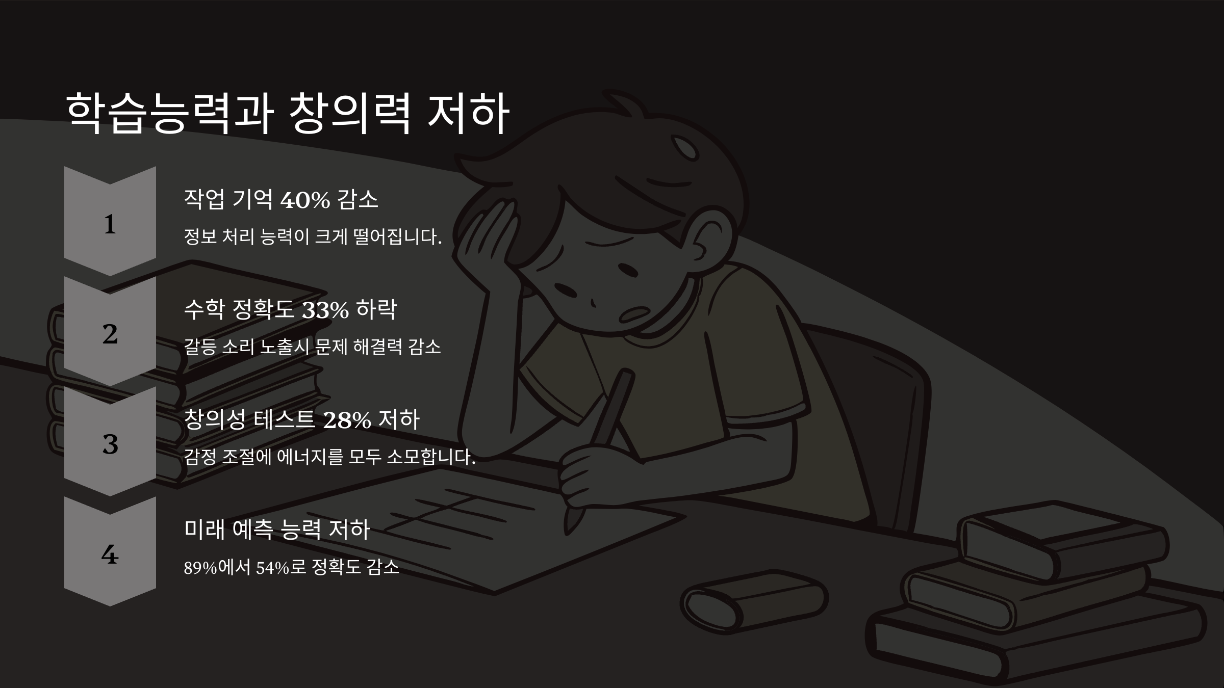 부모 갈등으로 인한 정서 불안은 아이의 학습 능력에도 직접적인 영향을 미쳐요. 작업 기억이라고 하는, 정보를 일시적으로 저장하고 처리하는 능력이 40%나 줄어들거든요. 2025년 실험에서는 갈등 소리를 들은 학생들의 수학 문제 해결 정확도가 33% 감소하고, 창의성 테스트 점수도 28% 떨어졌다고 해요.