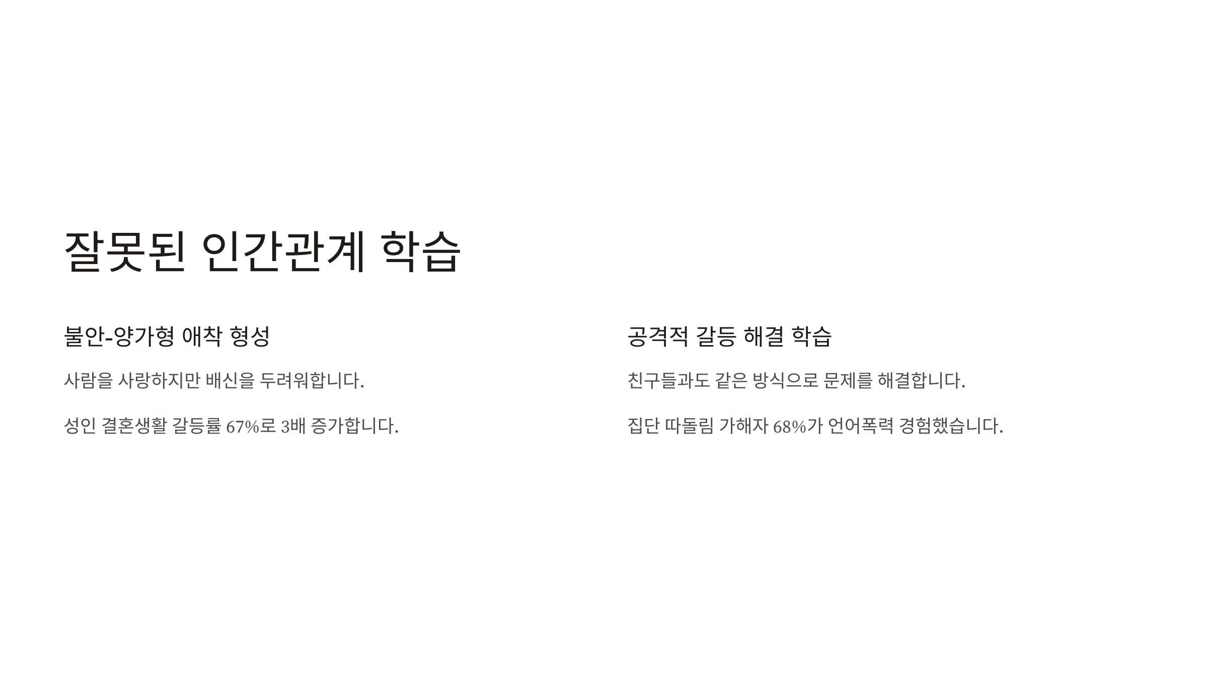 아이들은 부모를 보고 인간관계를 배워요. 그런데 부모가 자주 싸우는 모습을 보면 '관계에서 갈등이 생기면 소리를 지르고 화를 내는 게 정상'이라고 학습하게 되죠.