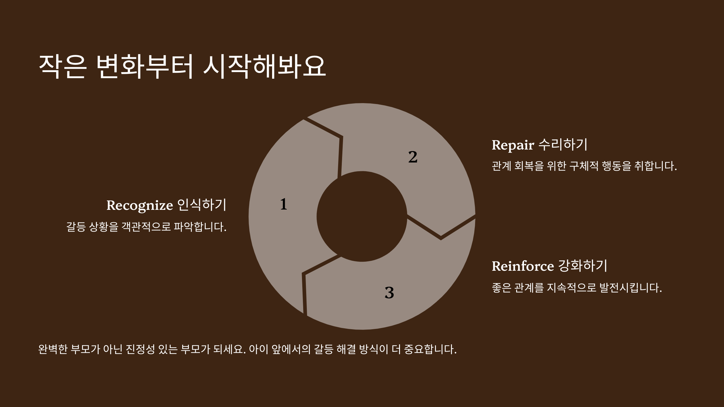 2025년 뉴욕대 연구팀이 제안한 '3R 원칙'을 기억해주세요. Recognize(인식하기) - Repair(수리하기) - Reinforce(강화하기)예요. 갈등을 인식하고, 관계를 수리하고, 좋은 관계를 강화하는 과정을 반복하는 거죠.