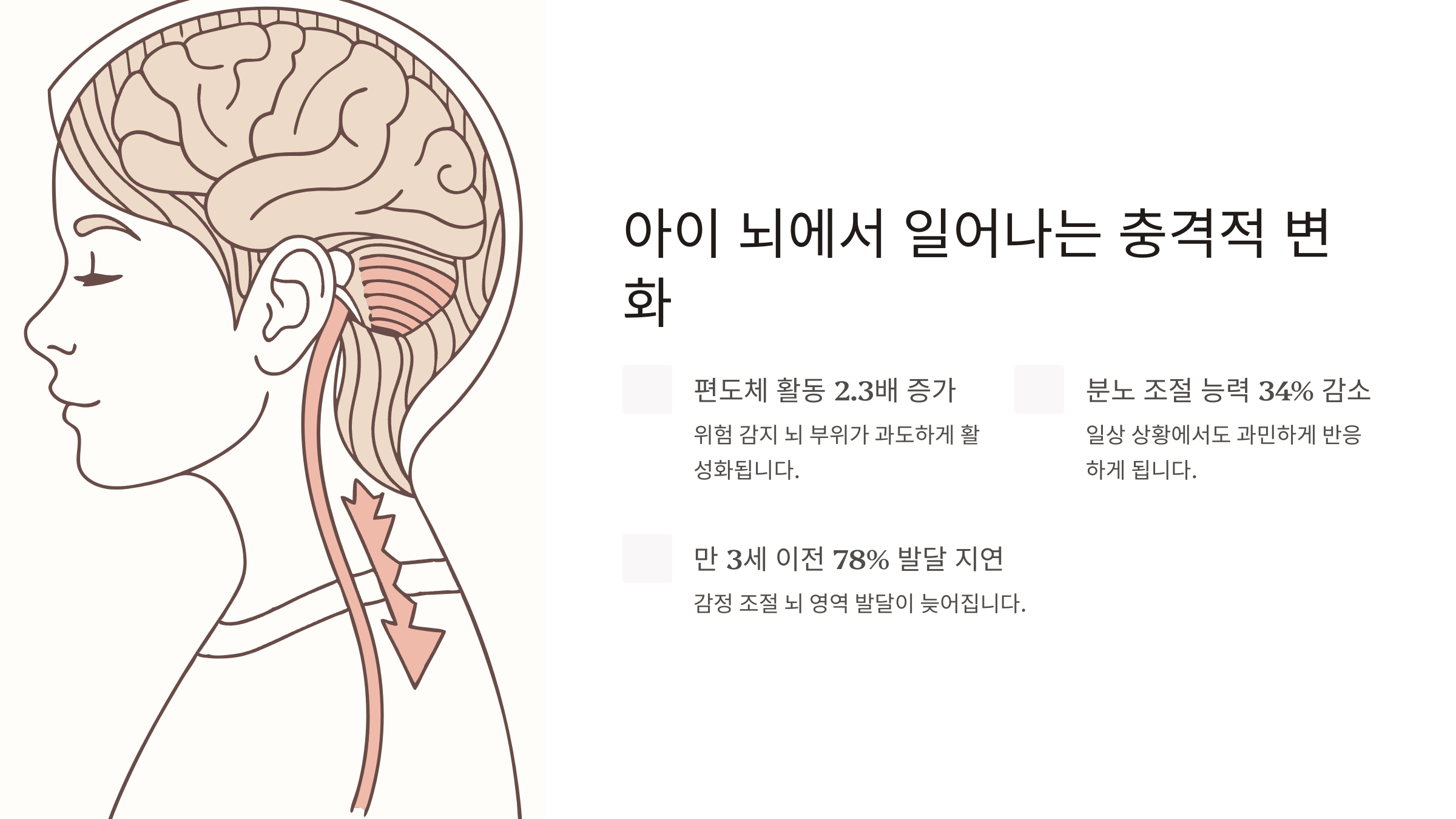 아이들이 부모의 갈등을 목격하면 편도체라는 뇌 부위의 활동이 2.3배나 증가해요. 편도체는 위험을 감지하는 역할을 하는데, 이 부분이 과도하게 활성화되면 아이가 일상적인 상황에서도 과민하게 반응하게 되죠. 더 심각한 건 분노를 조절하는 능력이 34%나 감소한다는 점이에요.