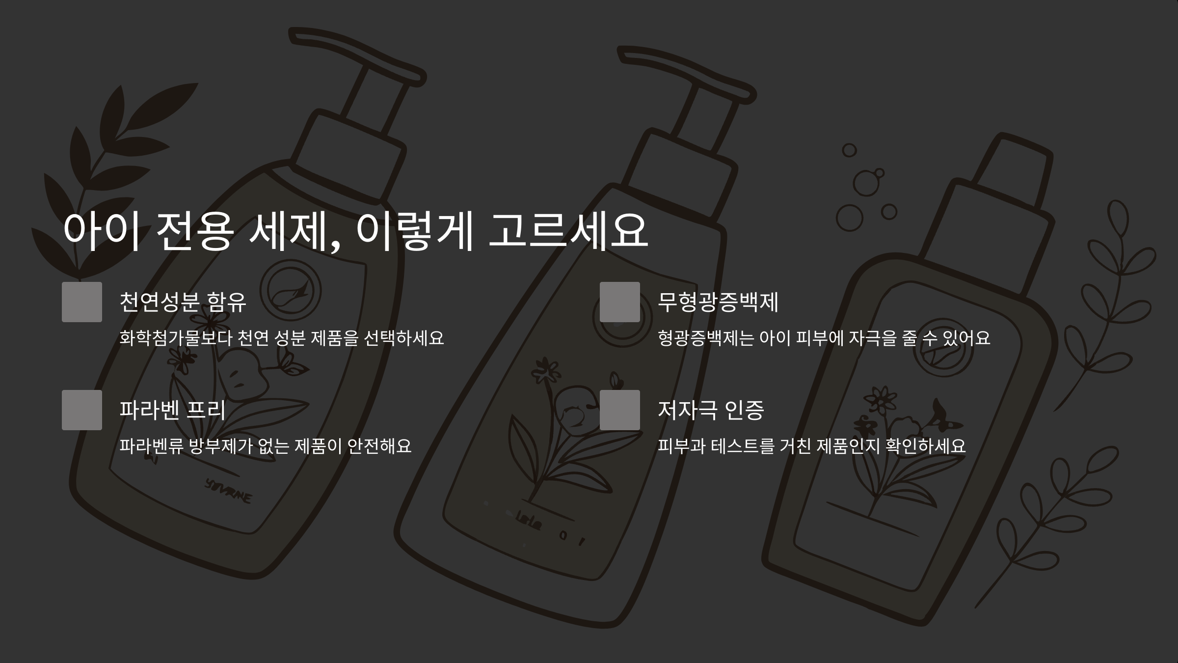 - 무형광증백제: 형광증백제는 아이 피부에 자극을 줄 수 있어요