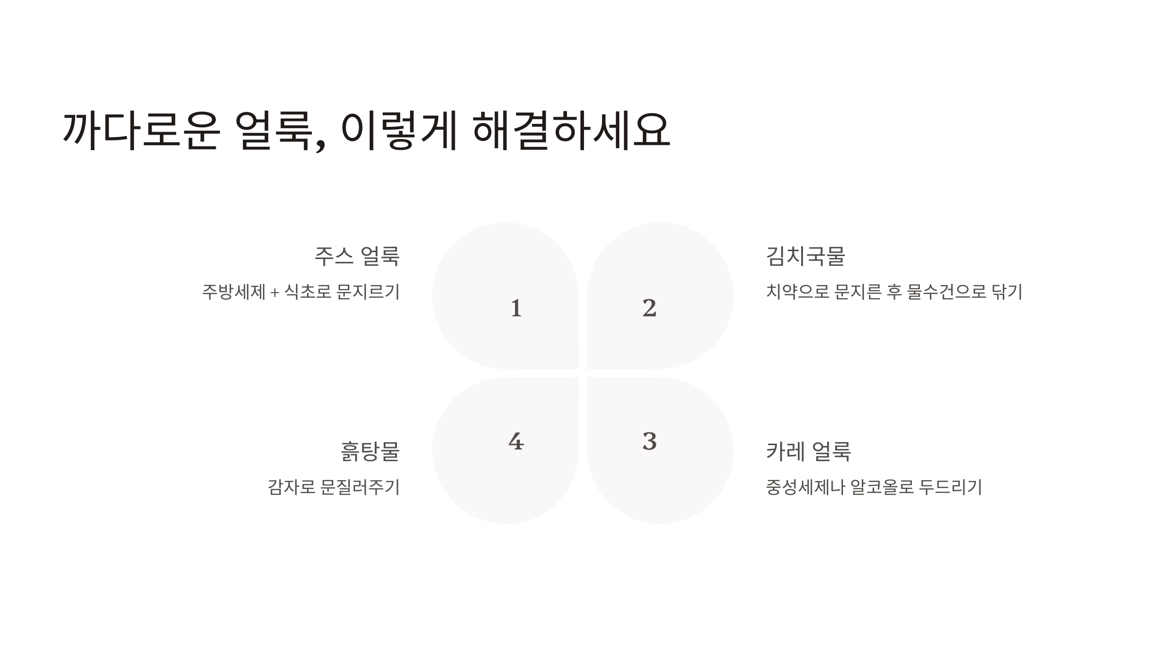 - 과일즙: 식초를 수건에 묻혀 두드리듯 닦아주세요