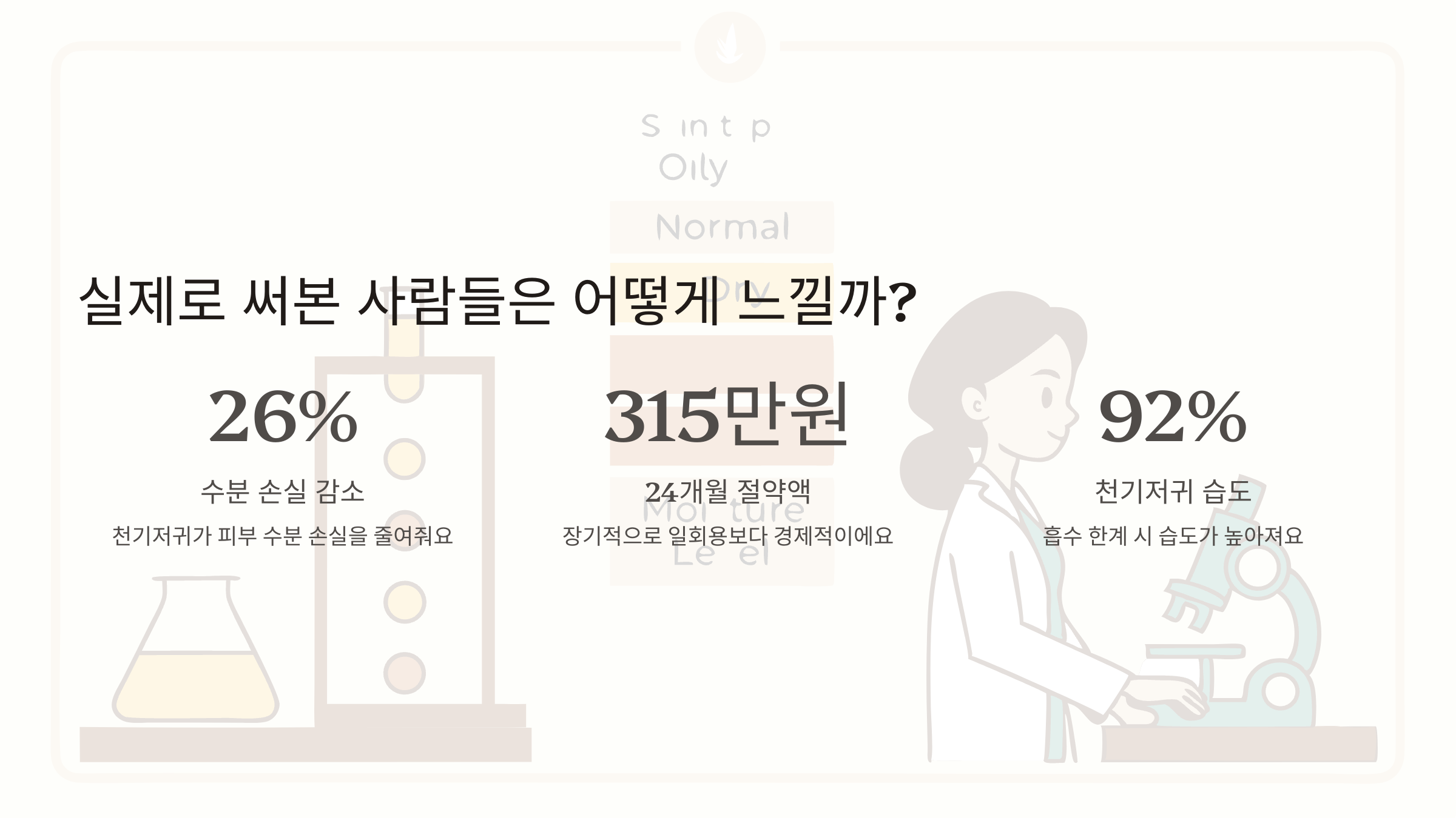서울대학교에서 실험해본 결과를 보면, 35도에 습도 80%인 환경에서 4시간 동안 착용했을 때 천기저귀가 피부 수분 손실을 26% 정도 줄여줬다고 해요.