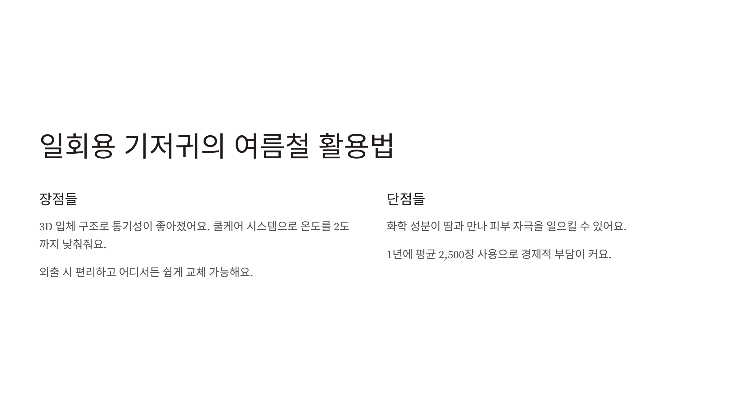 경제적으로도 부담이 되죠. 우리 아기들이 1년에 평균 2,500장 정도의 기저귀를 쓴다고 하니까, 여름철에는 더 많이 쓰게 되면 가계 부담이 만만치 않아요.