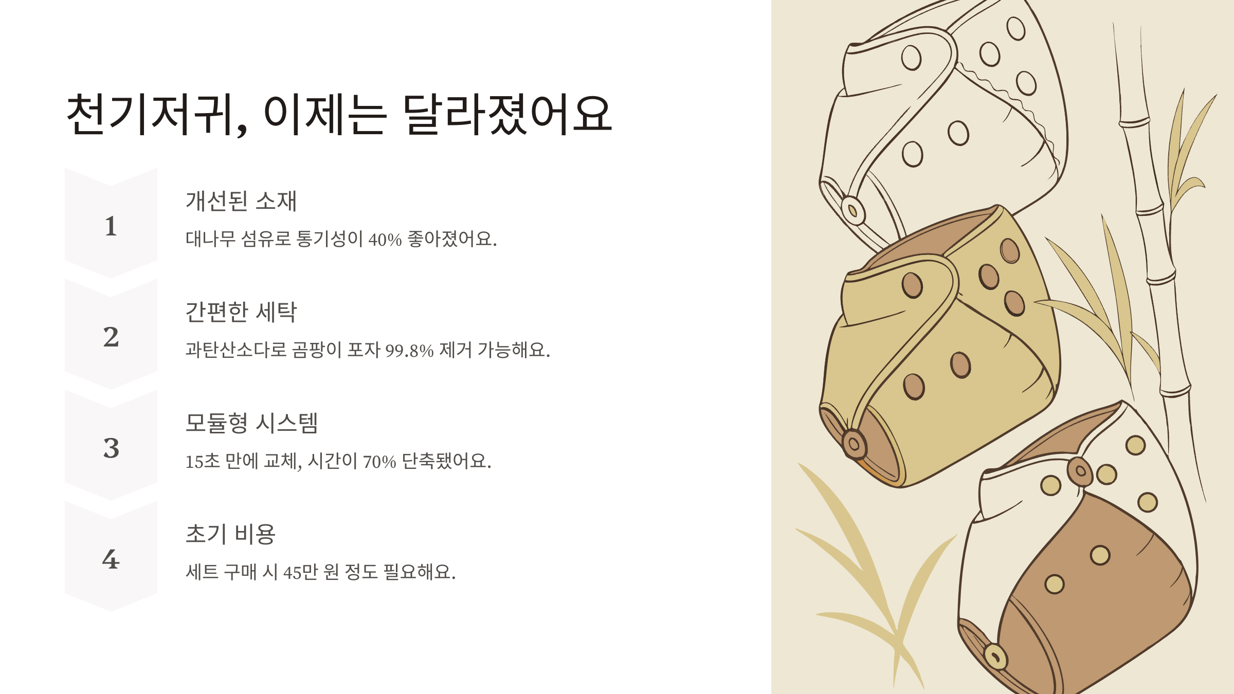하지만 여전히 초기 비용 부담이 있어요. 천기저귀 세트를 갖추려면 처음에 45만 원 정도는 들어가거든요. 물론 장기적으로 보면 훨씬 경제적이지만, 처음 시작할 때는 부담스러울 수 있어요.
