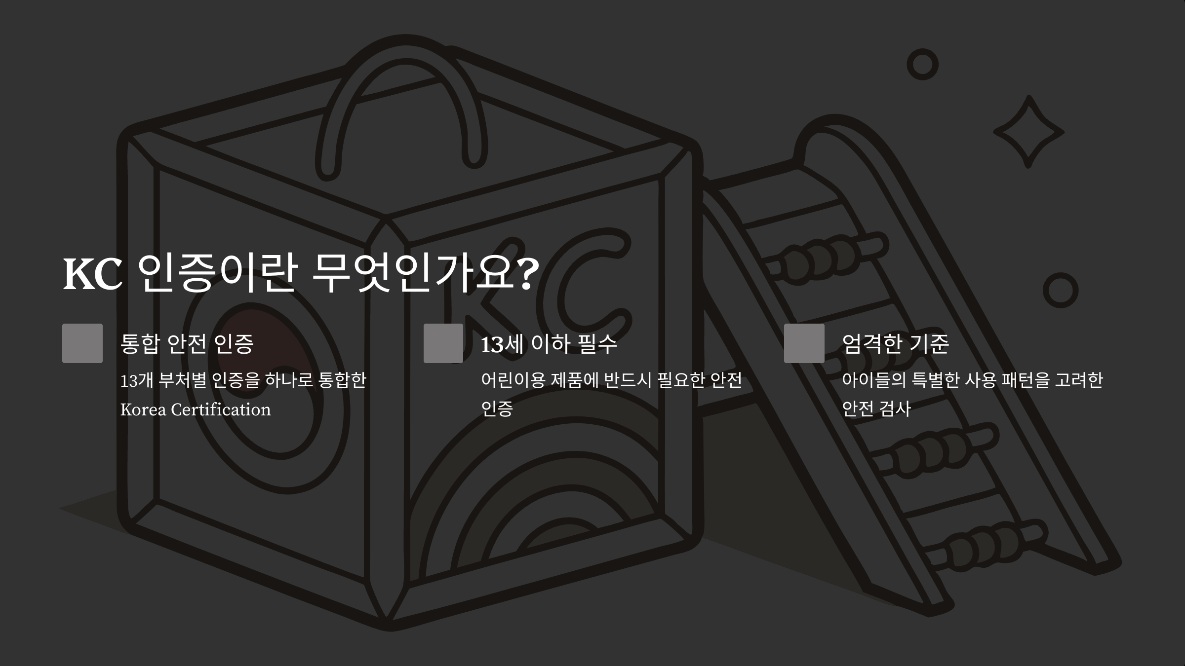 KC 인증은 Korea Certification의 줄임말로, 우리나라에서 13세 이하 어린이가 사용하는 제품에 꼭 필요한 안전 인증이에요. 예전에는 부처마다 다른 13개의 인증 마크가 있었는데, 이를 하나로 통합한 게 바로 KC 마크랍니다.