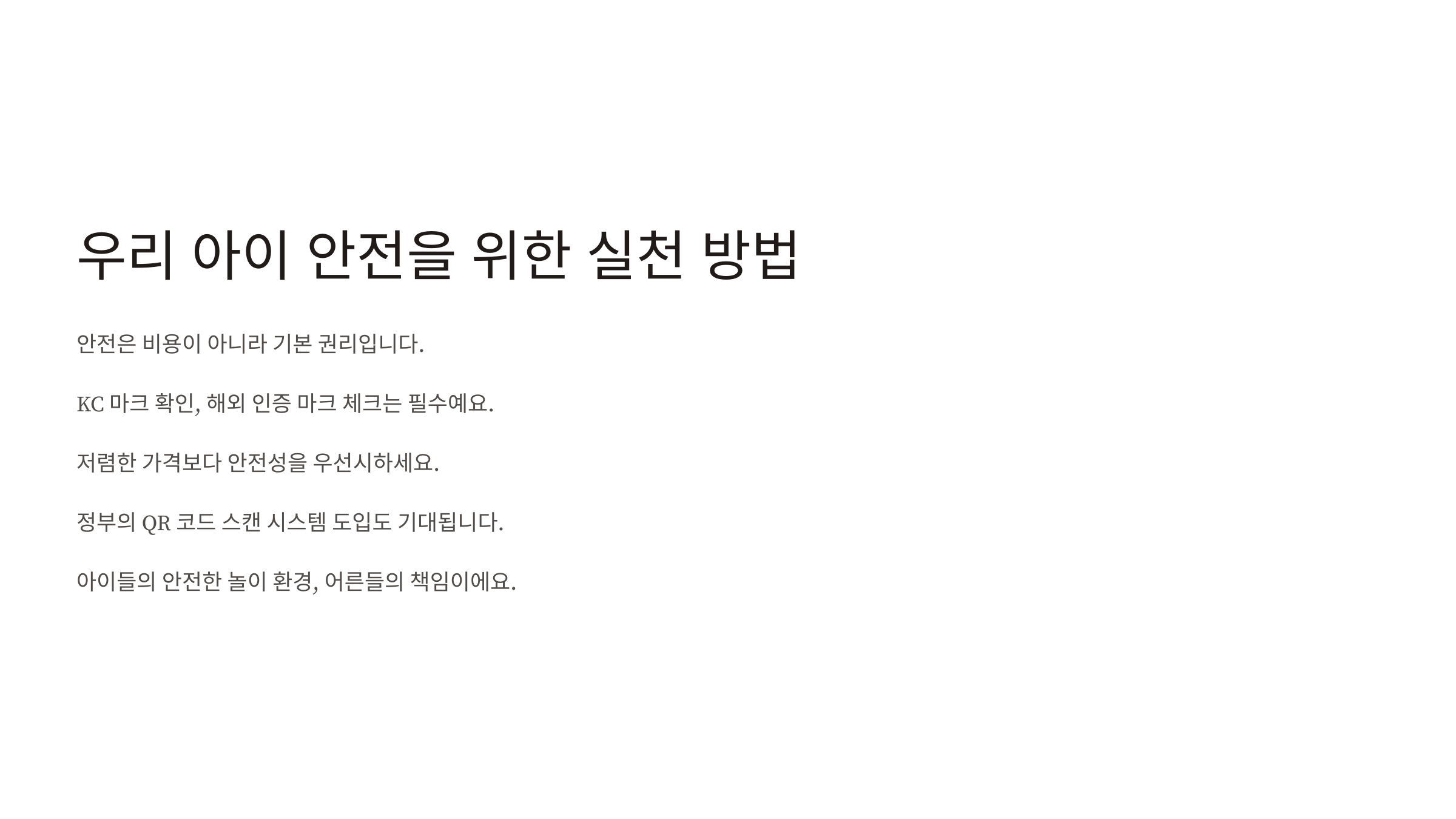 무엇보다 우리 모두가 '안전은 비용이 아니라 기본 권리'라는 생각을 가져야 해요. 아이들의 안전한 놀이 환경을 만드는 것, 어른들의 몫이니까요.