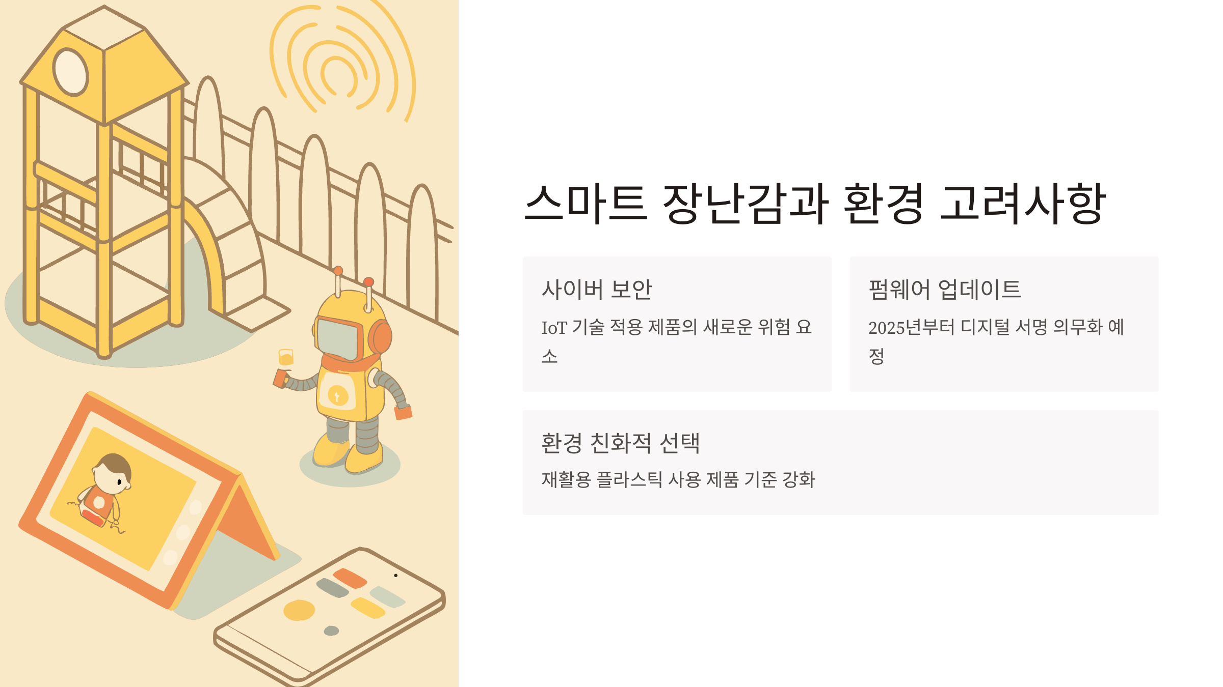 요즘 IoT 기술이 적용된 교육용 완구들이 많아지고 있어요. 이런 제품들은 기존 안전성뿐만 아니라 사이버 보안도 고려해야 해요. 2025년부터는 펌웨어 업데이트 기능에 대한 디지털 서명이 의무화될 예정이에요.