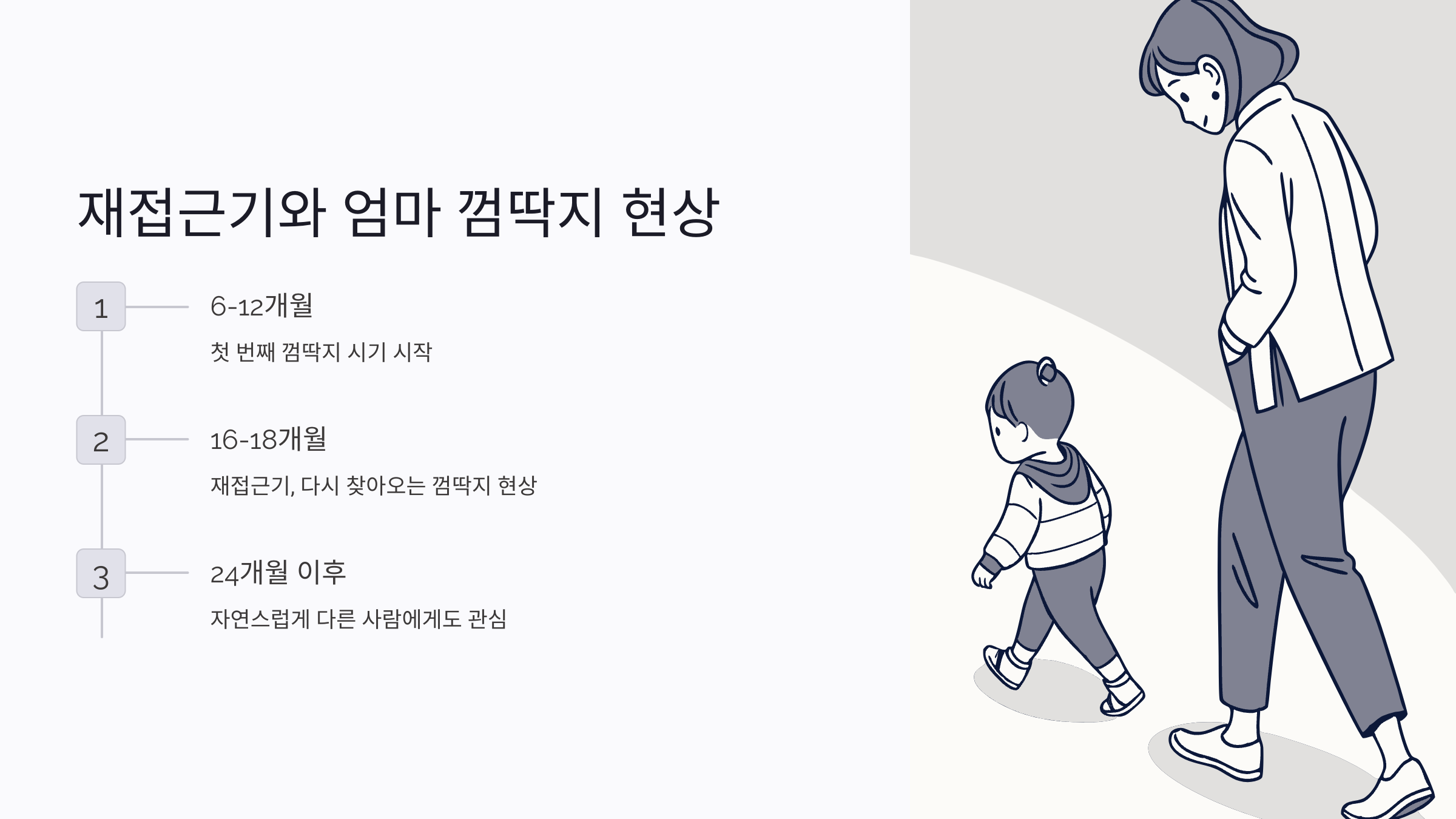 아기 껌딱지 시기는 보통 생후 6개월부터 시작되어 6~12개월에 한 번, 16~18개월 사이에 한 번 더 찾아와요. 이런 모습을 보고 애정 결핍이라고 걱정하시는 분들이 있는데, 오히려 사람을 좋아하는 아이들에게서 자주 나타나는 정상적인 현상이에요.