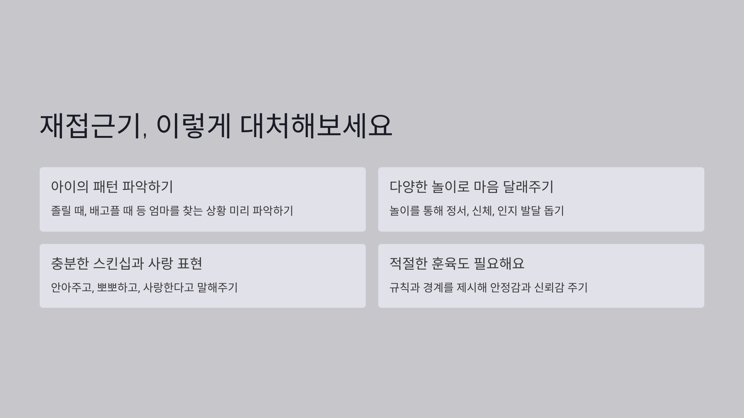 하루 종일 떼를 쓰는 것 같아도 자세히 관찰해보면 패턴이 있어요. 졸릴 때, 배고플 때, 심심할 때 주로 엄마를 찾는다면, 이런 상황을 미리 파악해서 대비할 수 있어요. 예방이 최고의 대처법이랍니다!
