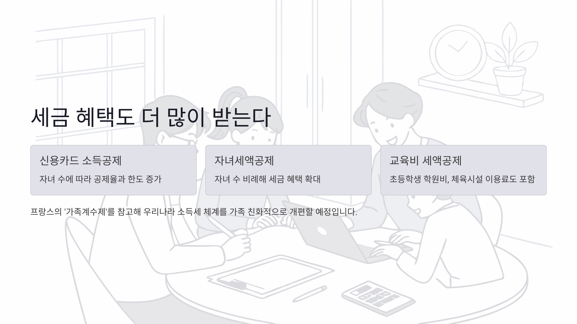 프랑스의 '가족계수제'를 참고해서 우리나라 소득세 체계를 가족 친화적으로 바꾸는 것도 검토하고 있대요. 또 초등학생 학원비나 체육시설 이용료도 교육비 세액공제 대상에 포함시켜서 맞벌이 부부들의 부담을 줄여준다고 하고요.