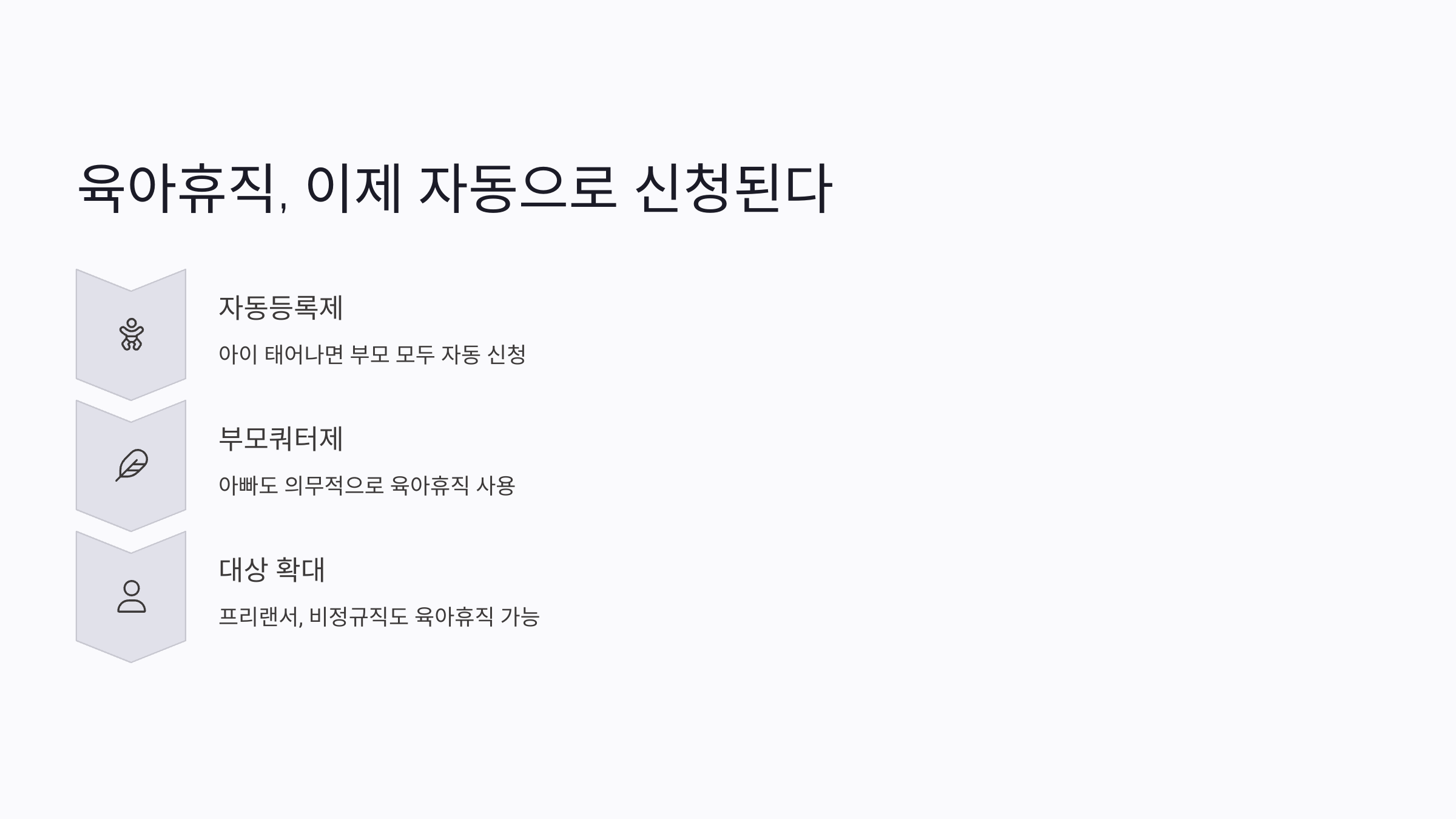 육아휴직도 완전히 바뀌어요. 지금은 회사에 따로 신청해야 하고, 눈치도 봐야 하고 그랬잖아요. 앞으로는 아이가 태어나면 부모 둘 다 자동으로 육아휴직이 신청된다고 해요.