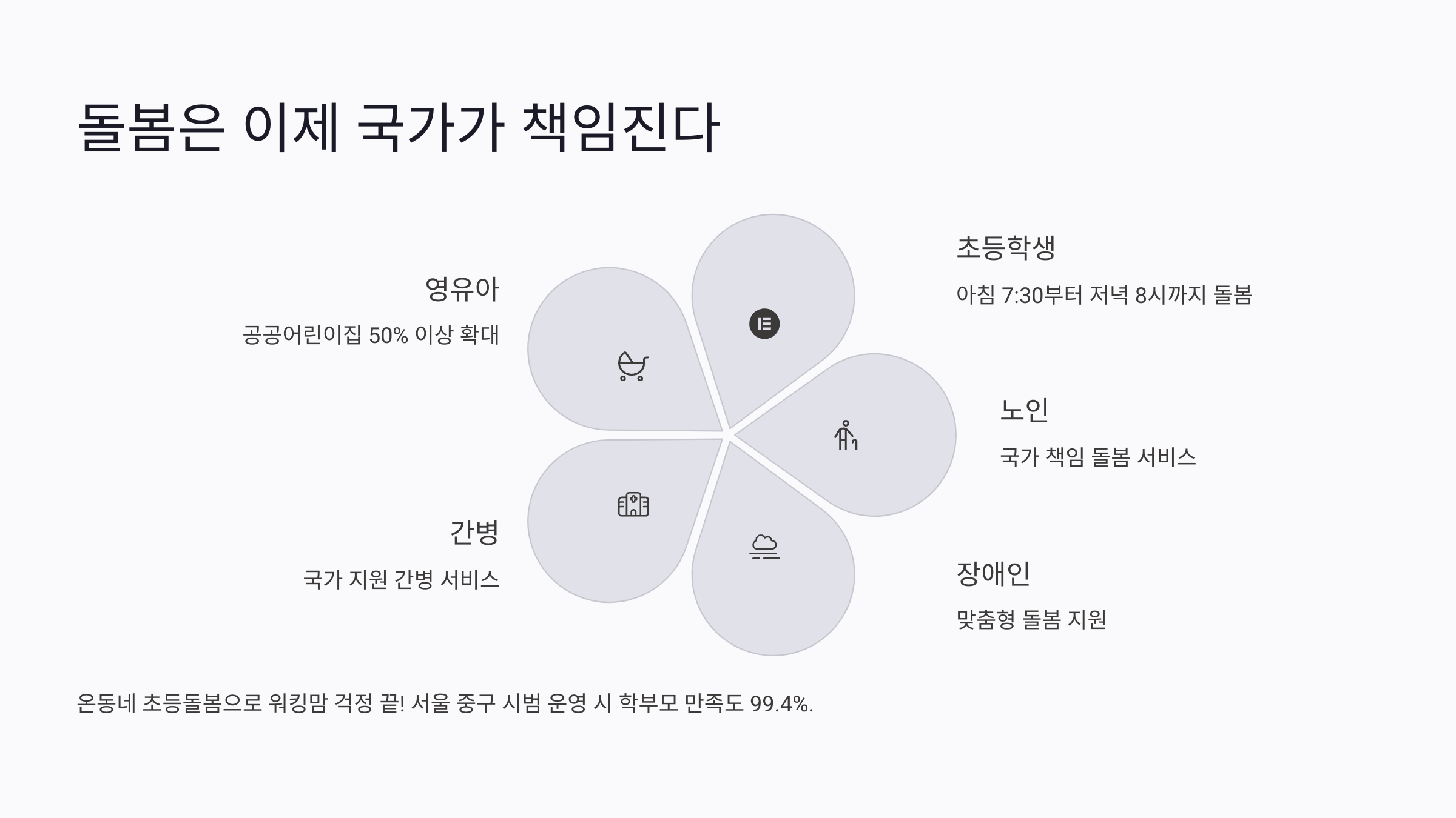 이제 돌봄을 가족이나 개인이 알아서 해야 하는 일이 아니라, 국가가 책임지는 일로 바뀌어요. 영유아, 초등학생, 노인, 장애인, 간병 이렇게 5개 분야에서 국가가 직접 나서서 돌봄 서비스를 제공한다는 거예요.