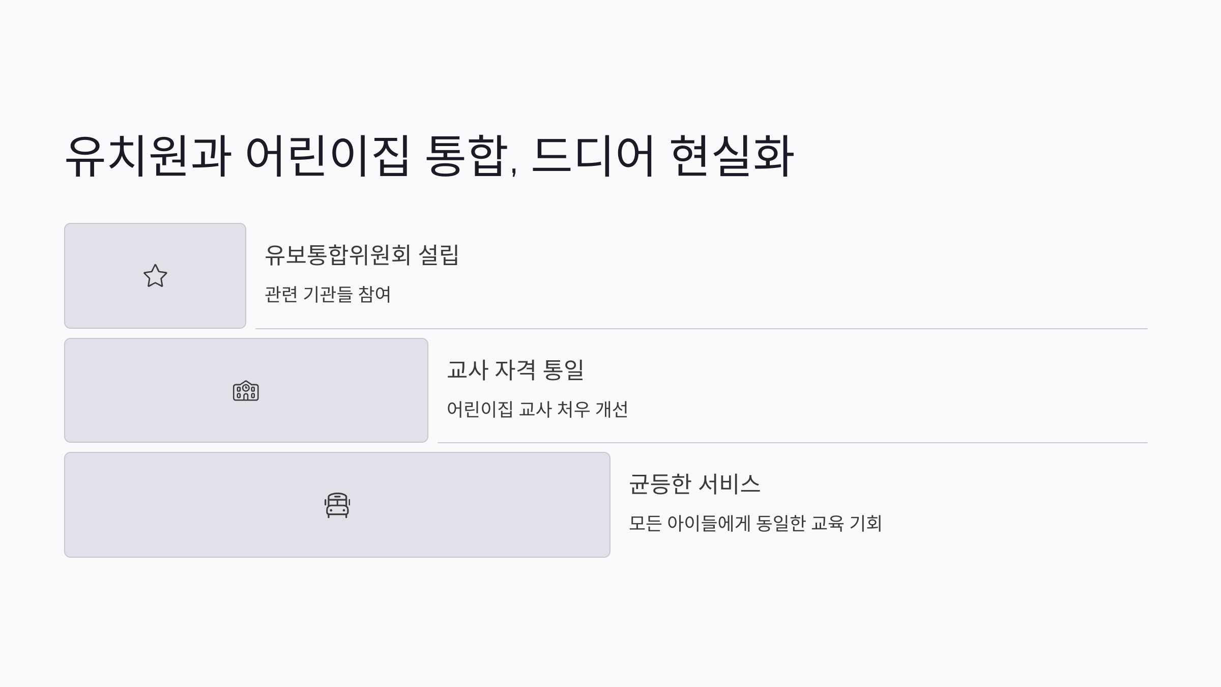 몇 년째 말만 나오던 유치원-어린이집 통합이 드디어 본격화돼요. 지금은 유치원은 교육부, 어린이집은 복지부가 각각 관리해서 부모들이 헷갈리기도 하고, 아이들이 받는 서비스 질도 달랐거든요.