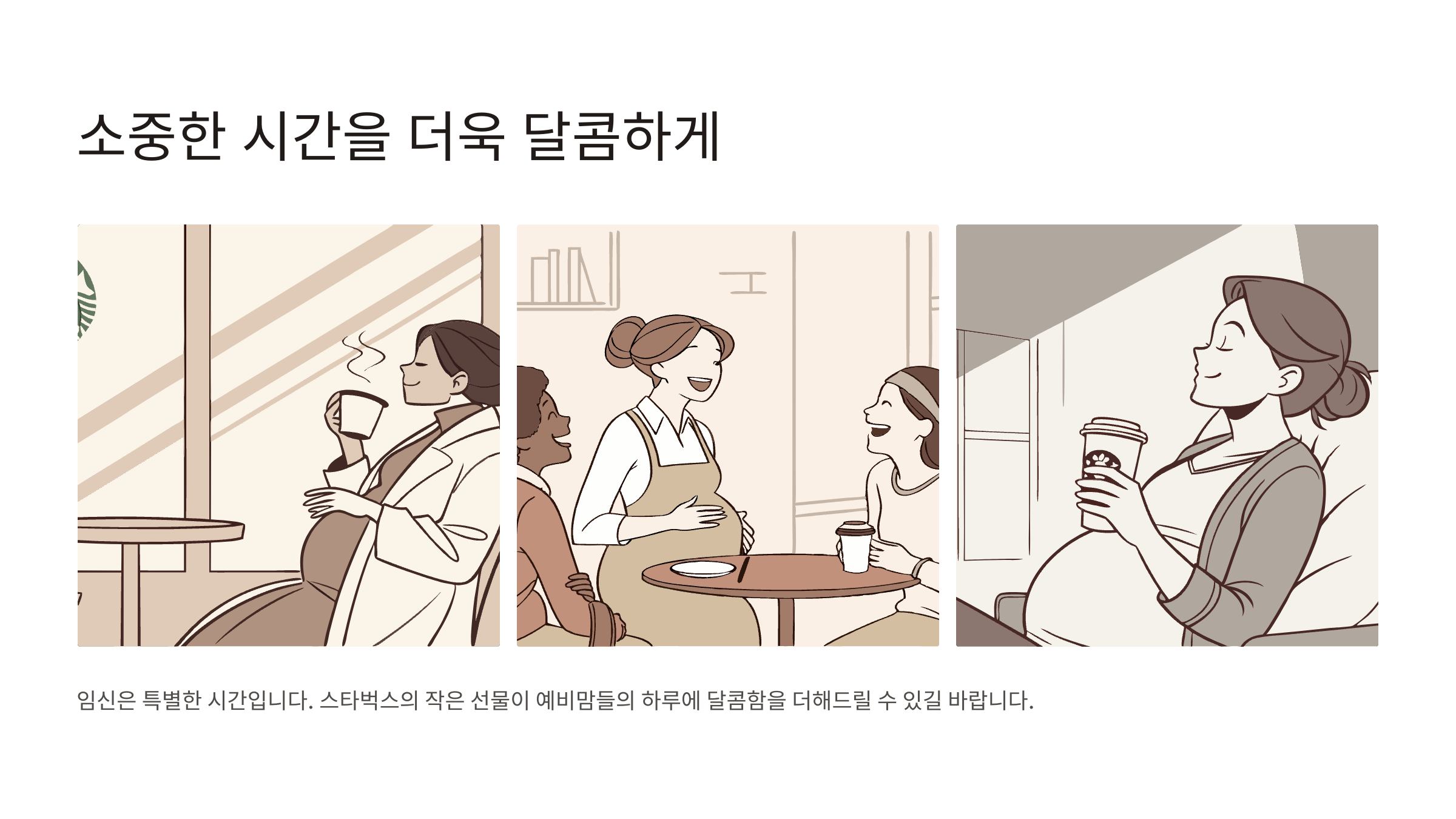 스타벅스의 작은 선물이 예비맘들의 하루에 조금이나마 달콤함을 더해드릴 수 있었으면 좋겠어요. 따뜻한 차 한 잔과 함께 잠시 여유를 가지시거나, 친구들과 수다를 떨면서 행복한 추억을 만드시길 바라요.