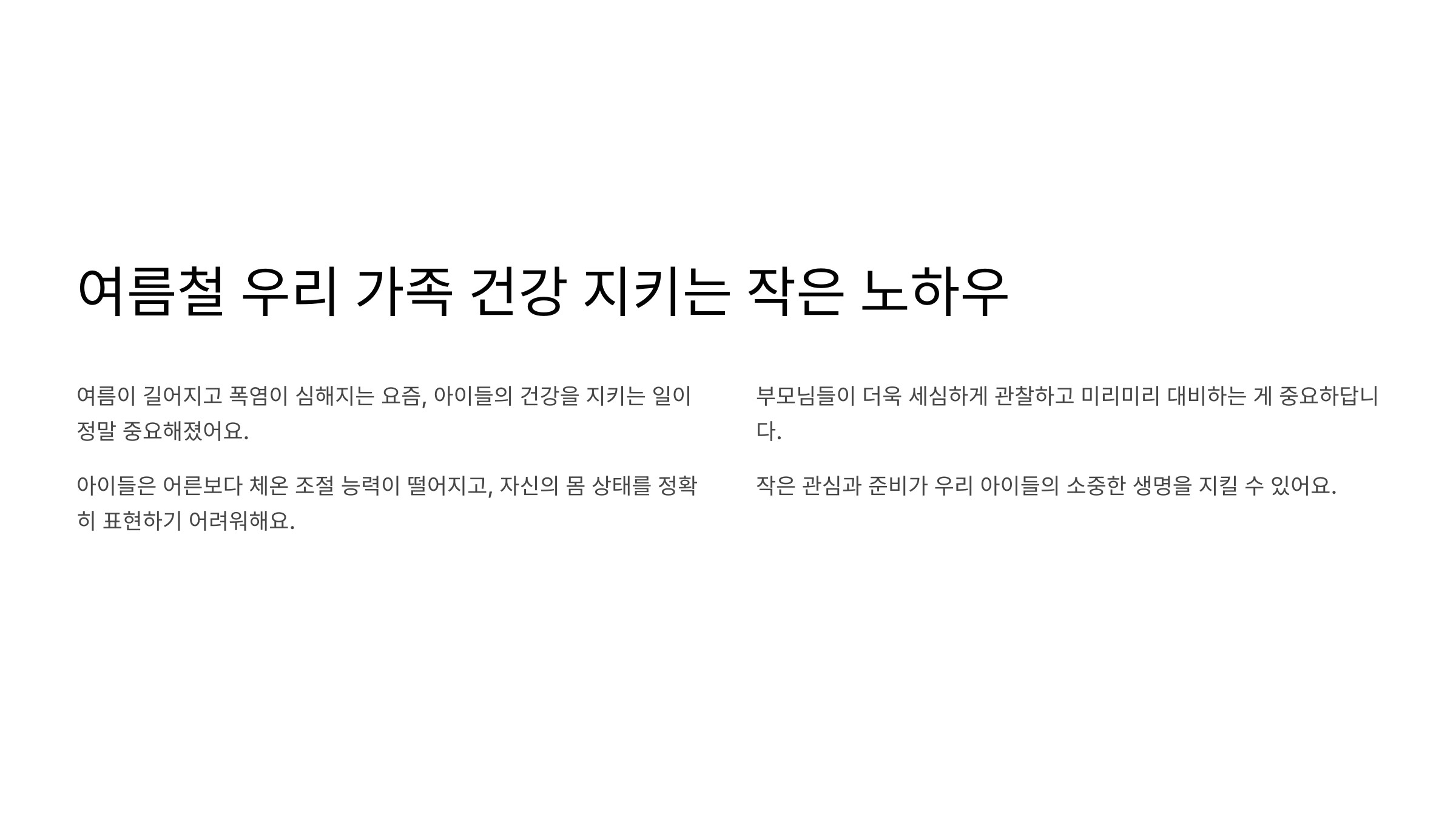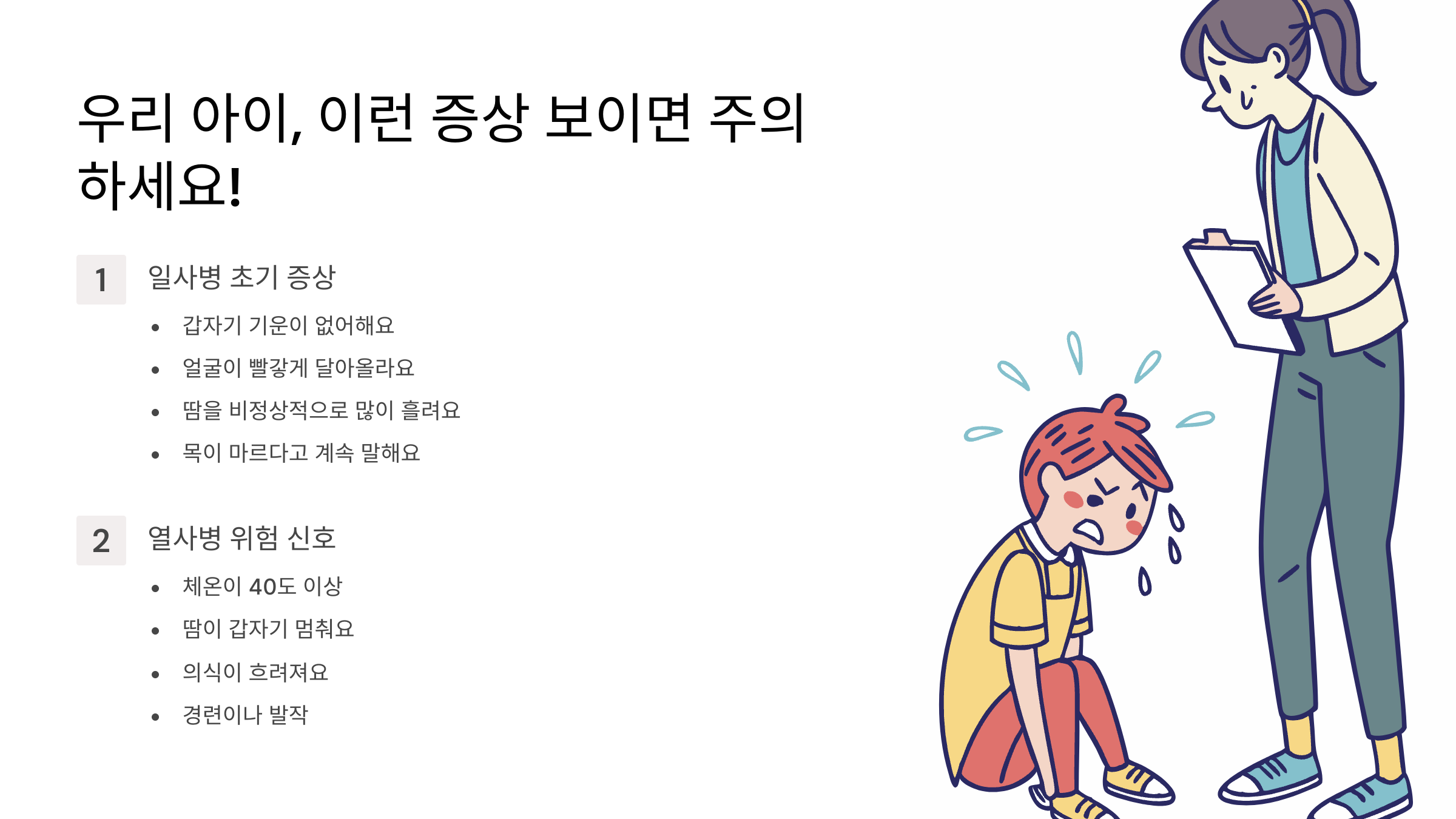 여름이 길어지고 폭염이 심해지는 요즘, 아이들의 건강을 지키는 일이 정말 중요해졌어요. 무엇보다 예방이 최선이라는 걸 잊지 마세요.