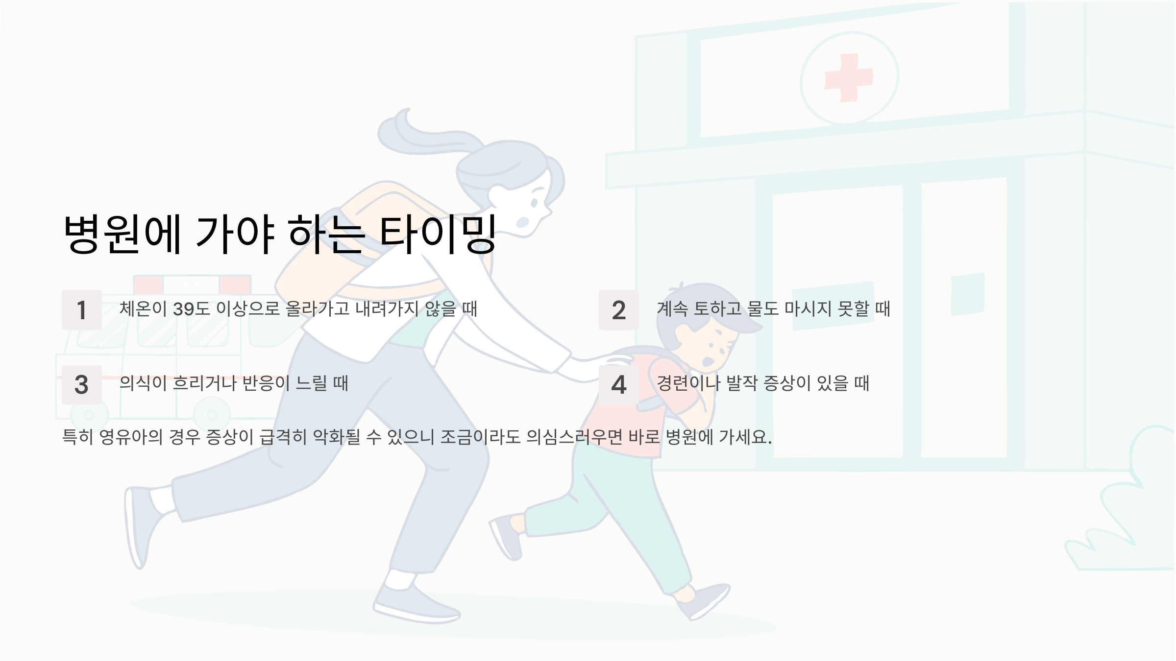 특히 영유아의 경우 증상이 급격히 악화될 수 있으니 조금이라도 의심스러우면 바로 병원에 가시는 게 좋아요.