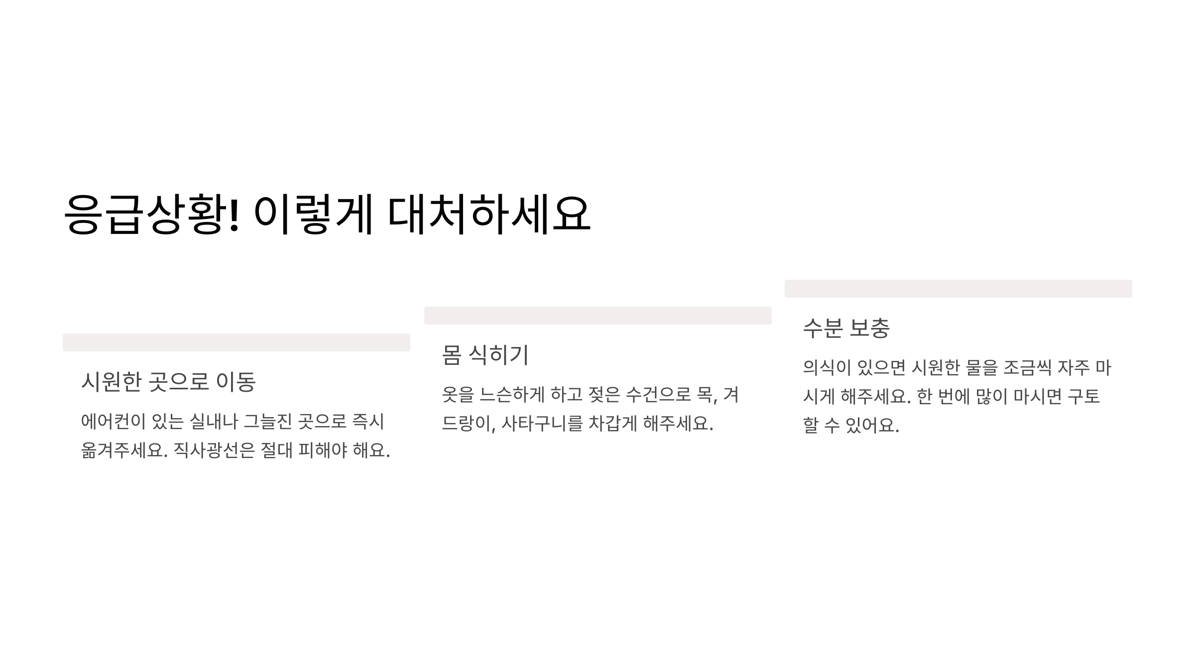 - 일사병 응급처치를 했는데도 30분 이상 증상이 개선되지 않을 때