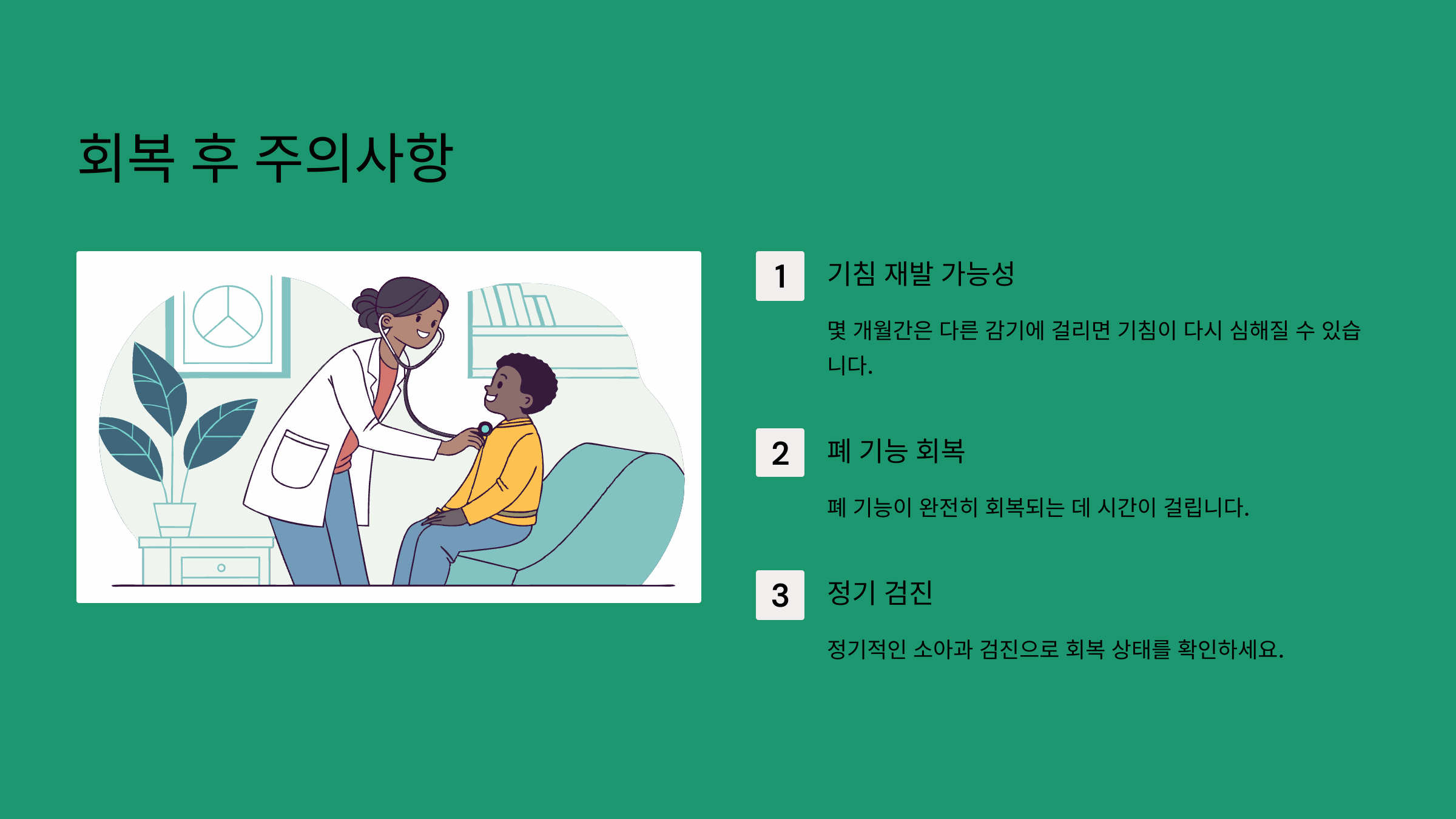 - 정기적인 소아과 검진을 받아서 회복 상태를 확인하세요