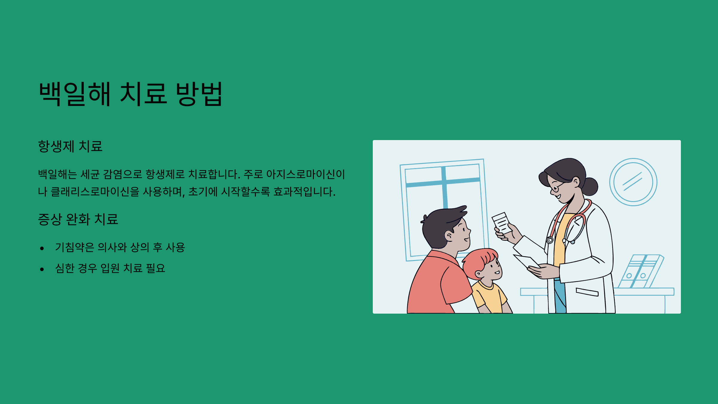 백일해는 세균 감염이라서 항생제로 치료해요. 보통 아지스로마이신이나 클래리스로마이신을 사용하는데, 증상 초기에 시작할수록 효과가 좋아요.