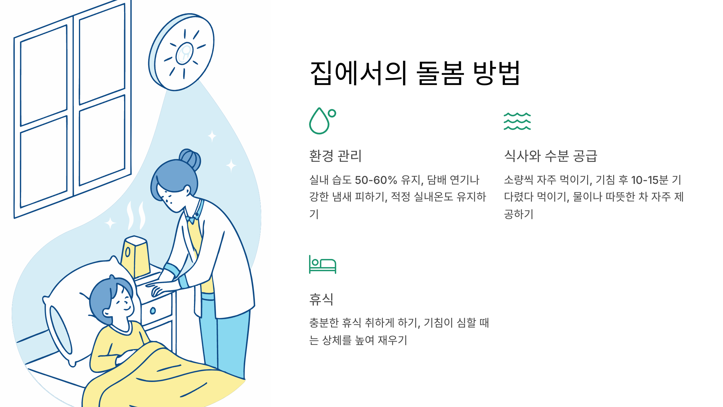 - 심한 경우에는 입원해서 산소 공급이나 영양 공급을 받을 수도 있어요