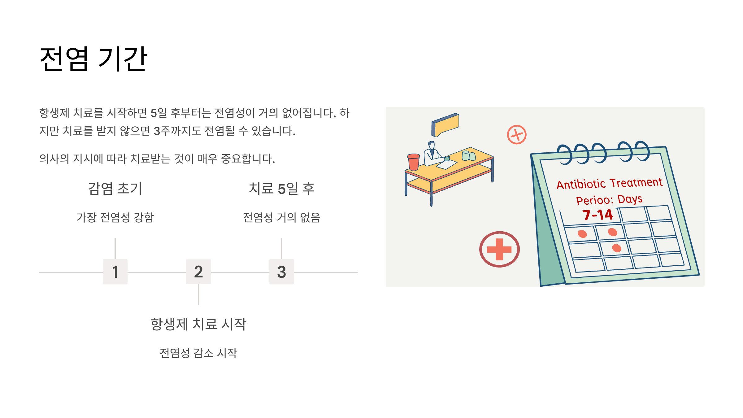 항생제 치료를 시작하면 5일 후부터는 전염성이 거의 없어져요. 하지만 치료를 안 받으면 3주까지도 전염될 수 있어서, 꼭 의사의 지시에 따라 치료받는 것이 중요해요.