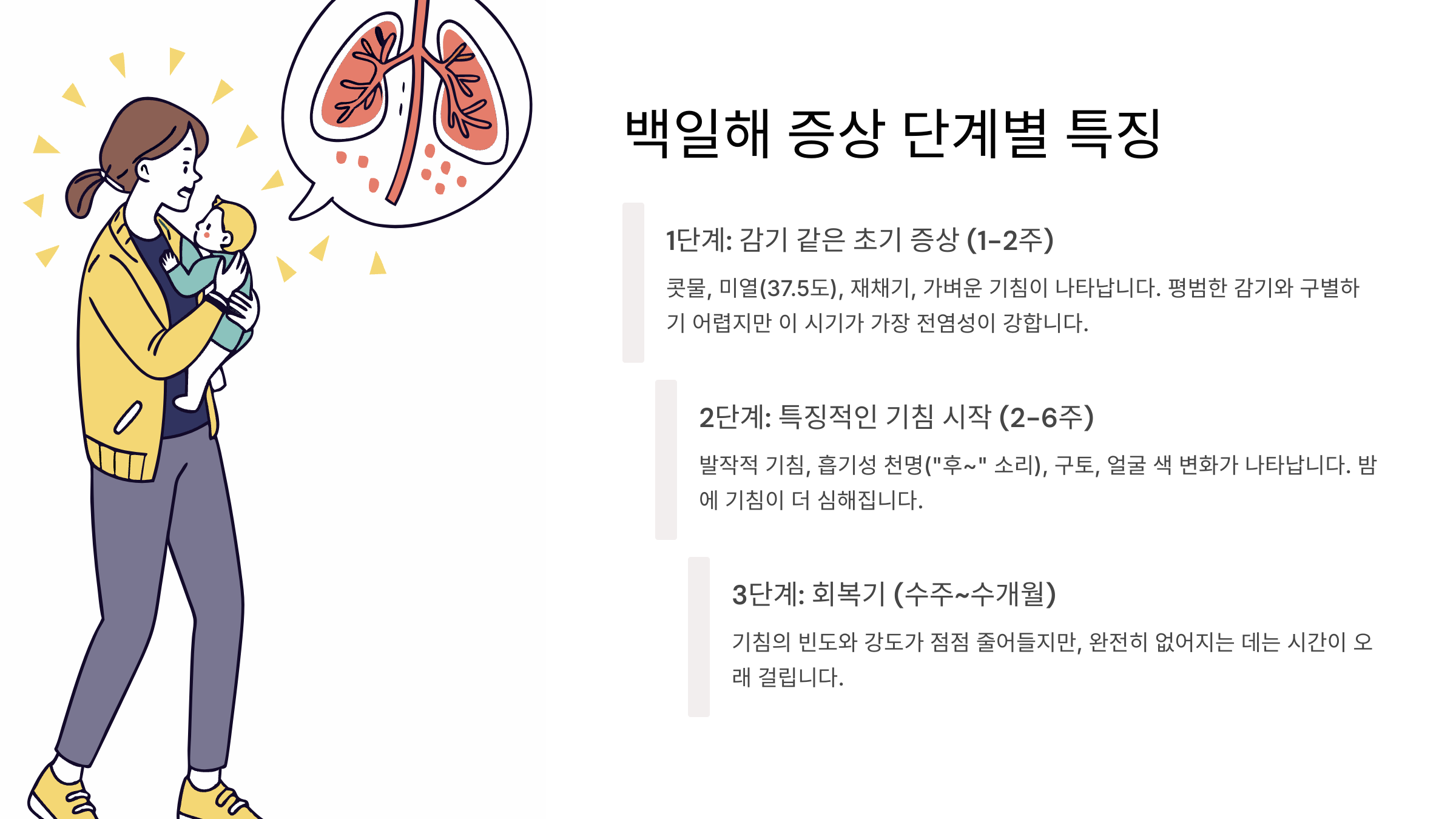이때부터 백일해만의 특별한 증상들이 나타나기 시작해요: