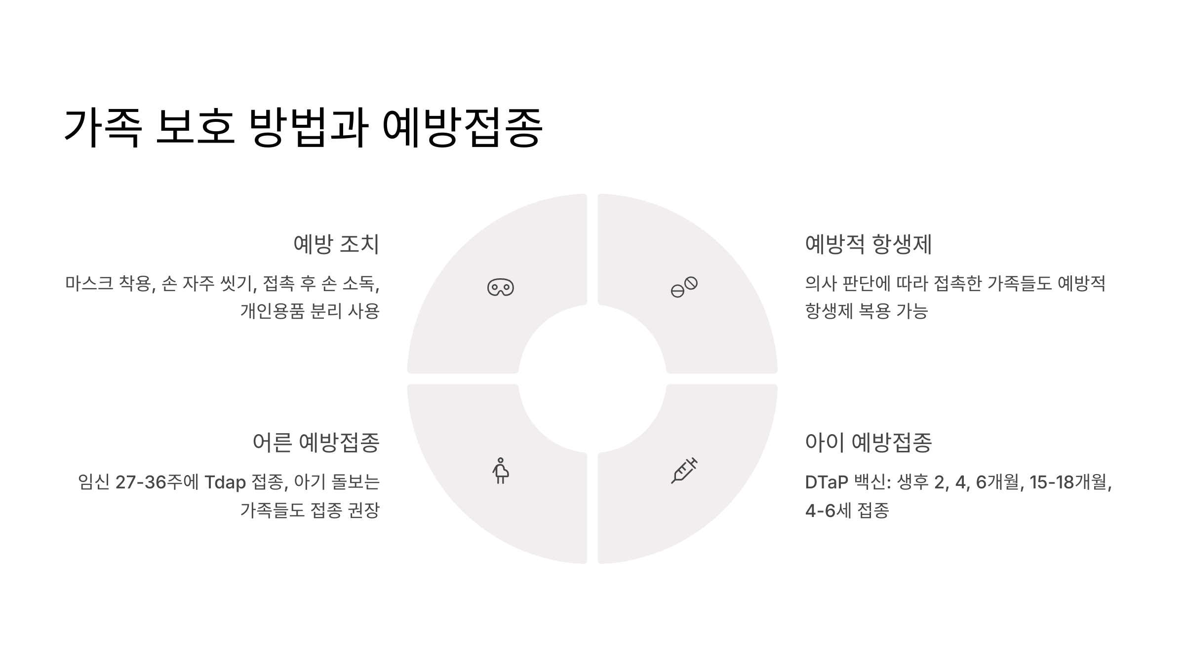 - 임신 중 27-36주에 Tdap 접종 (아기에게 항체 전달)